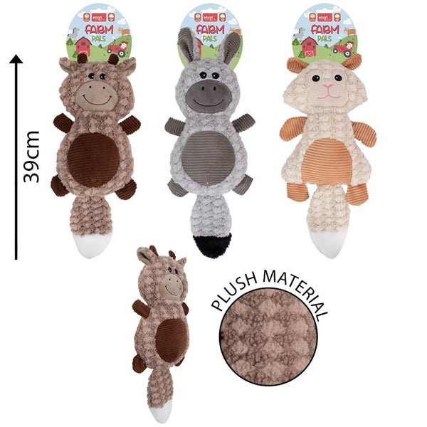 super soft, plush farm animal dog toy with squeaker and crinkly tail