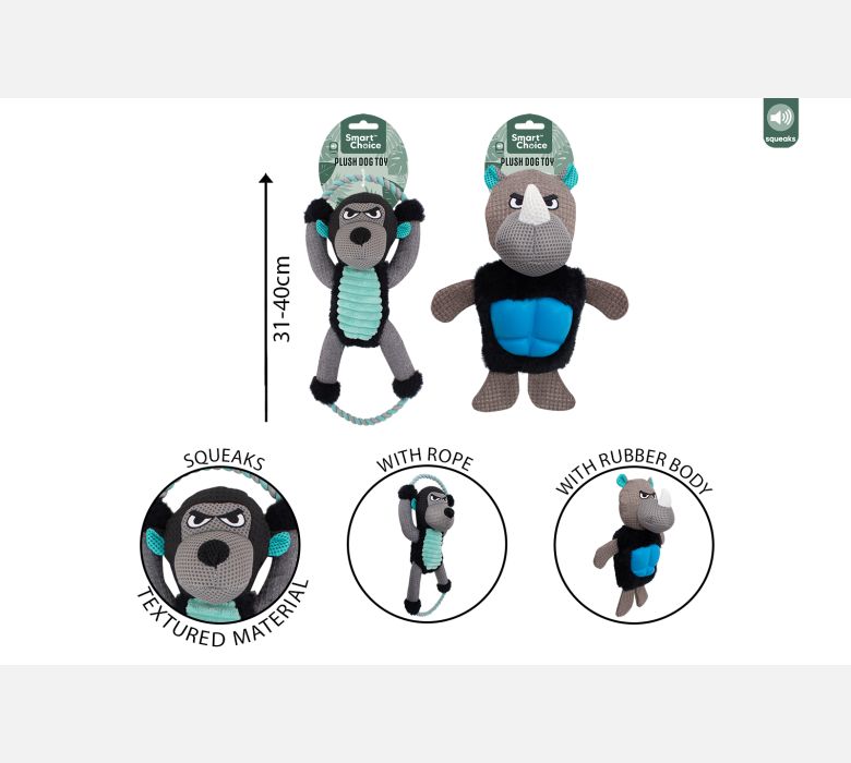 - Two designs: Rhino with TPR body & Gorilla with rope on arms and legs